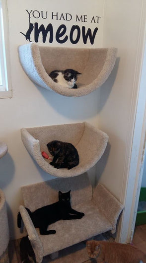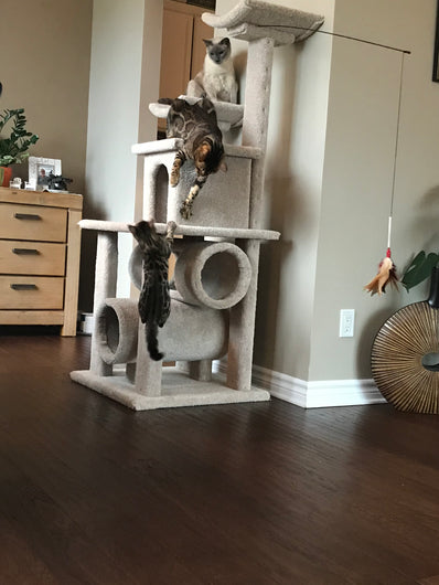 Hi there. Just wanted to say a huge thank you for the wonderful products we have purchased from you. We purchased 2 cat trees, a cat condo and wall bed. The moment we brought them into the house, the cats were all over them! Our one cat Rosie has taken over the wall bed and it is her "go to" spot in the house. Blissa loves to stand on top of the cat trees. We have placed them so they are flush under Windows, so she stands on top of them and watches "cat TV" for hours. The cat trees have also saved our furniture! Both cats love to scratch them! We also frequently spend ages looking for the cats only to find them happily fast asleep in the cat tunnels. Lol. We love that your cat furniture is made using safe products and we can certainly vouch for the high quality of everything you make. Looking forward to our next purchase from you!