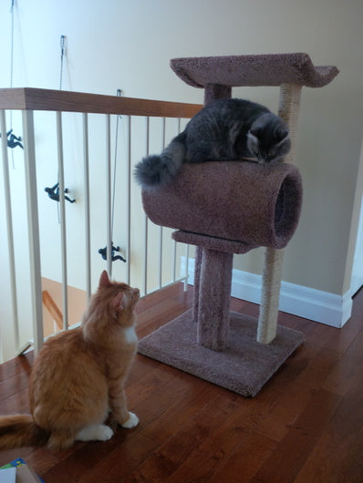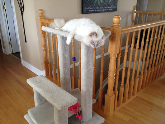 "Here's a picture of Bubba's love affair with his new cat tree. He simply loves it, he's tried every level and we couldn't get him off for the rest of the day and night!